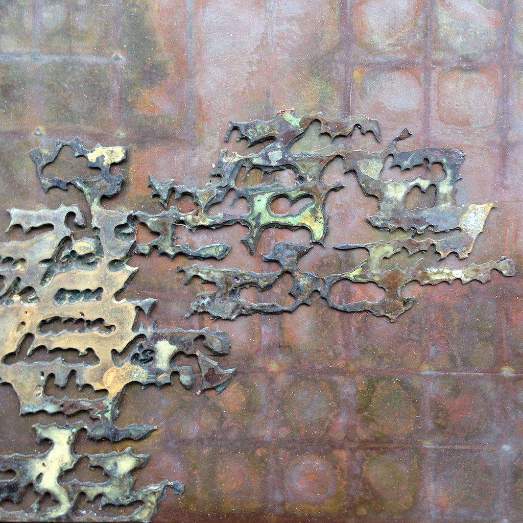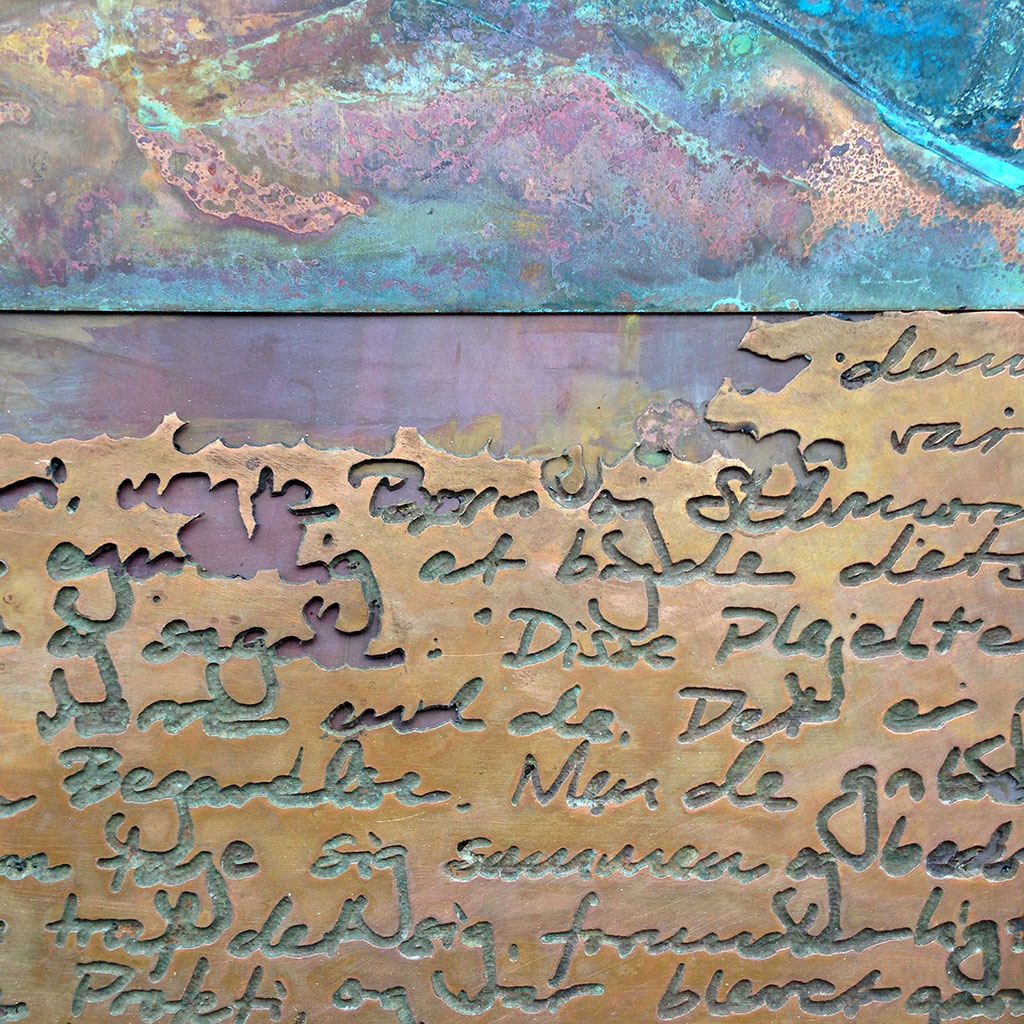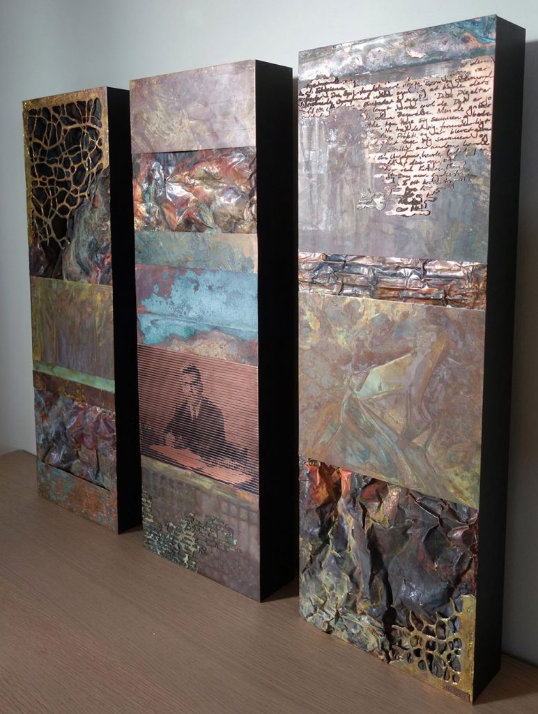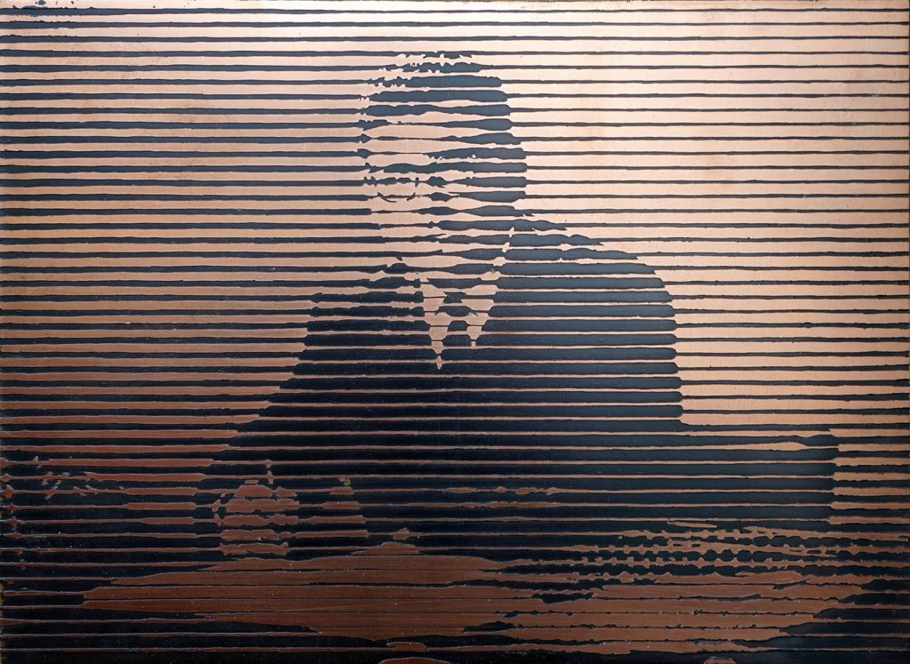 This is “Living Origins” – a portrait of Joseph Brockdorff, who was one of Malta’s greatest media pioneers. The portrait was commissioned by his son and daughter, through whom the family business lives on. It hangs in the boardroom of BPC in Malta. The portrait was made of etched and patinated copper, bronze and brass. The three parts each measure 25×75 cm. This short video shows the process of the portrait’s creation. (Best seen in high definition.)Below is the photo that the portrait was based on. This was transferred by hand to the copper and etched as can be seen in the result on the right. Details of the work follow, as well as the full work shown from a different angle.