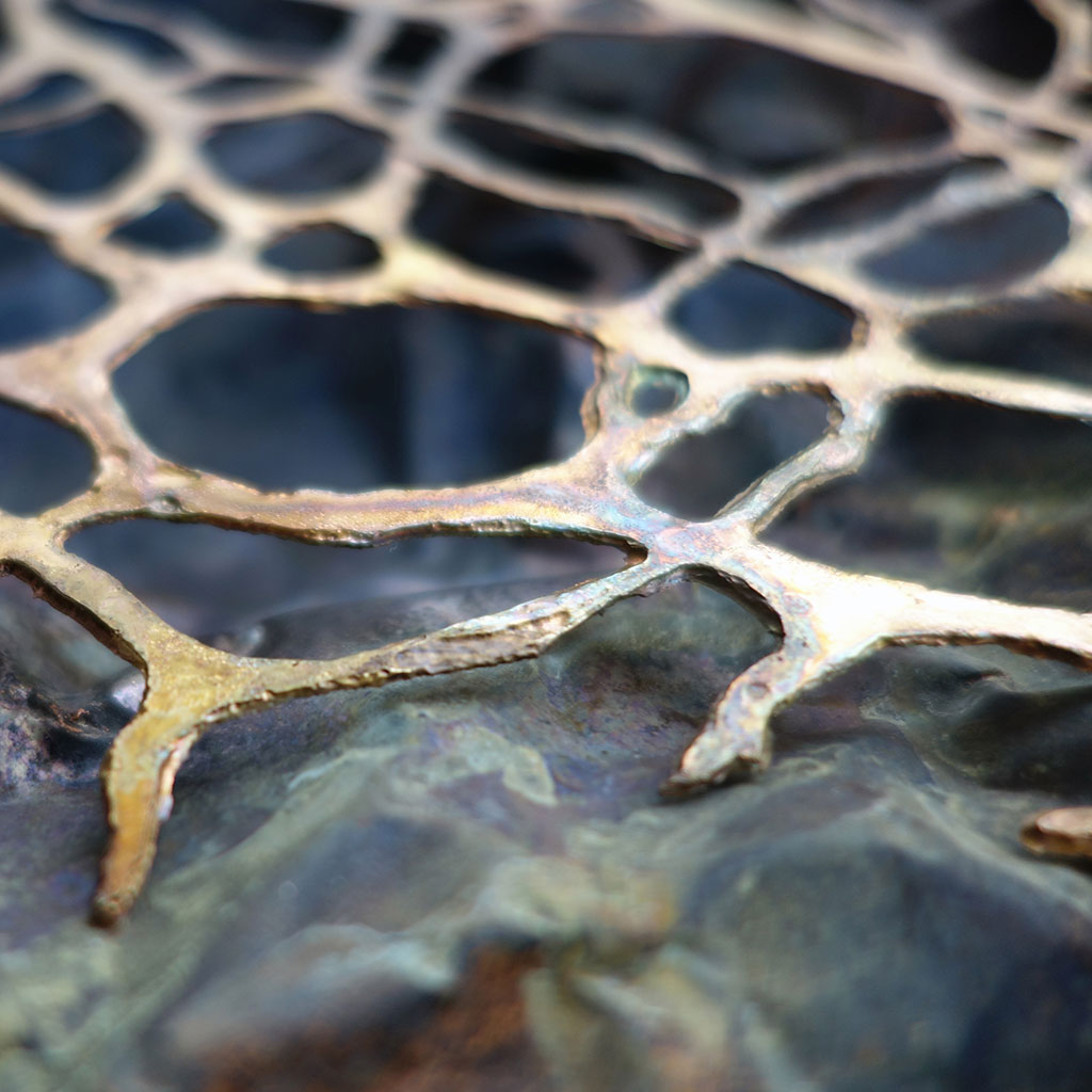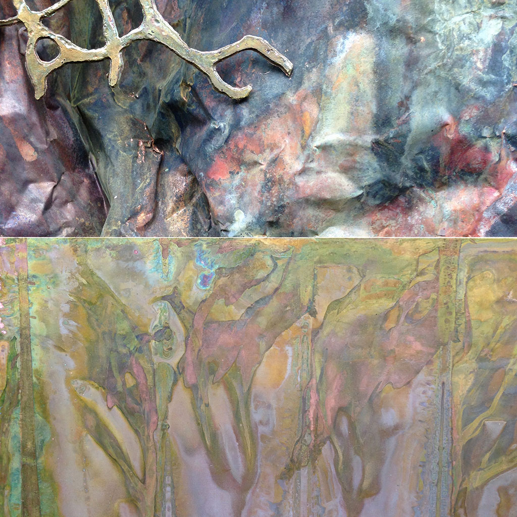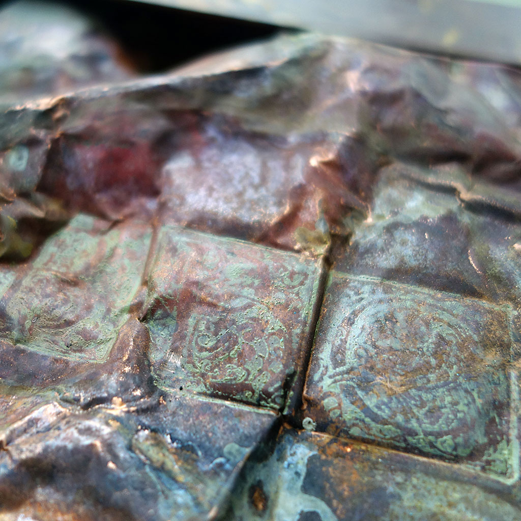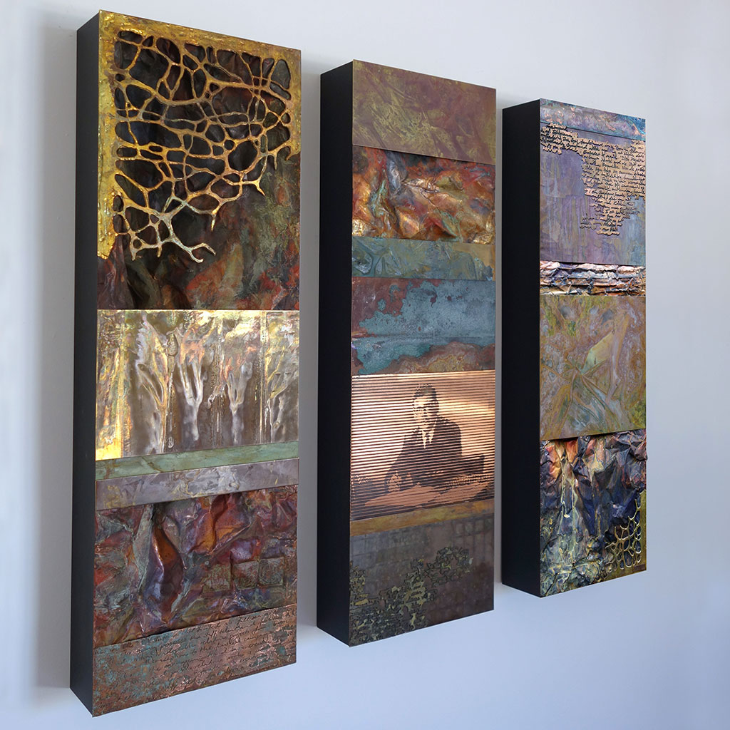 This is “Living Origins” – a portrait of Joseph Brockdorff, who was one of Malta’s greatest media pioneers. The portrait was commissioned by his son and daughter, through whom the family business lives on. It hangs in the boardroom of BPC in Malta. The portrait was made of etched and patinated copper, bronze and brass. The three parts each measure 25×75 cm. This short video shows the process of the portrait’s creation. (Best seen in high definition.)Below is the photo that the portrait was based on. This was transferred by hand to the copper and etched as can be seen in the result on the right. Details of the work follow, as well as the full work shown from a different angle.