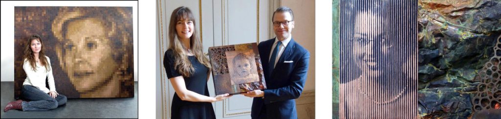 I have created a number of commissioned portraits. They can be large and extremely time-consuming, such as my portrait of Mrs Wilma Bernstein, wife of Mr. Stuart Bernstein, former US Ambassador to Denmark. It was created using 2867 squares of individually patinated bronze. It’s a “puzzle” that is months and months in the making. The result is one that is basically abstract up close, and almost photographic at a distance. More recently I have created a number of etched “line portraits” of business leaders, royalty and private individuals. These works give the portrayed person a diverse and dynamic context, consisting of three-dimensional areas, many different structures and patterns and often a very personal text. The many different warm nuances of the metal vary a lot depending on the surroundings. These portraits are not one work of art, but many, and they are seen very differently depending on the light and angle at which the viewer sees them.