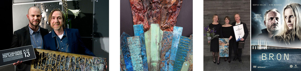 I have been creating prizes for different events for over a decade. They have been awarded to world-renowned architectural firms and outstanding people in different professions and even to an internationally successful TV series . Depending on the situation (the event, the winner, the timeline), in some cases an existing artwork which fits well is chosen the awarding body. Other times, the prize is entirely tailor-made and often in the form of a trophy of one kind or another. Of course, bespoke prizes do not have be trophies. They can be created like a “regular artwork”, such as the work “Surface Tension”, which was the Metal Prize (Plåtpriset) in 2013, and awarded to WHITE Architects at the PLÅT Seminar. The past two years, PLÅT have commissioned prizes from me that look more like a “trophy”, created in a way that means the recipient can decide whether to hang it on a wall or leave it free-standing. My latest prize for “Best Malmö Ambassador”, commissioned by Malmö Stad, was a wall-hung artwork with many of the visual components of a trophy. It also included a piece of 110 year old copper from a famous building in Malmö, linking the work even more strongly to the city itself.