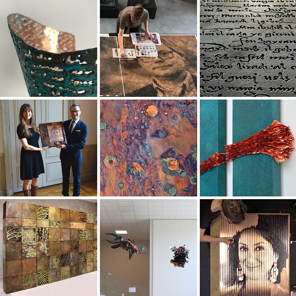 My commissions range from permanent installations in collaboration with architects or home owners, portraits for private homes (and in one case, royal palace) or corporations, prizes for different kinds of awards, bespoke pieces for museums and much more. Pictured here are a few examples. They are, left to right, top