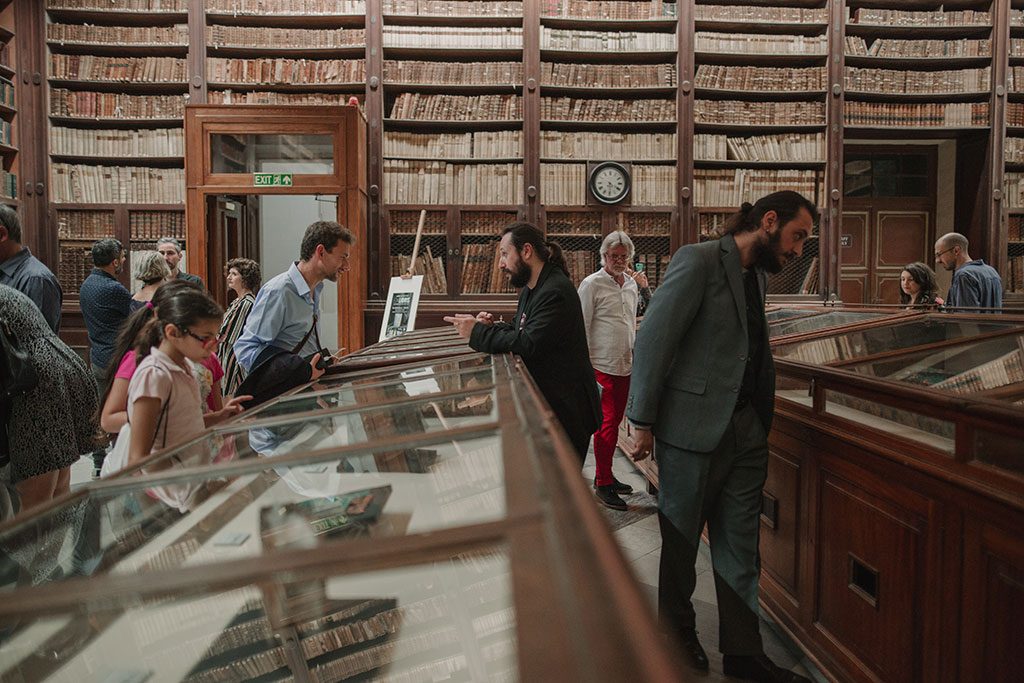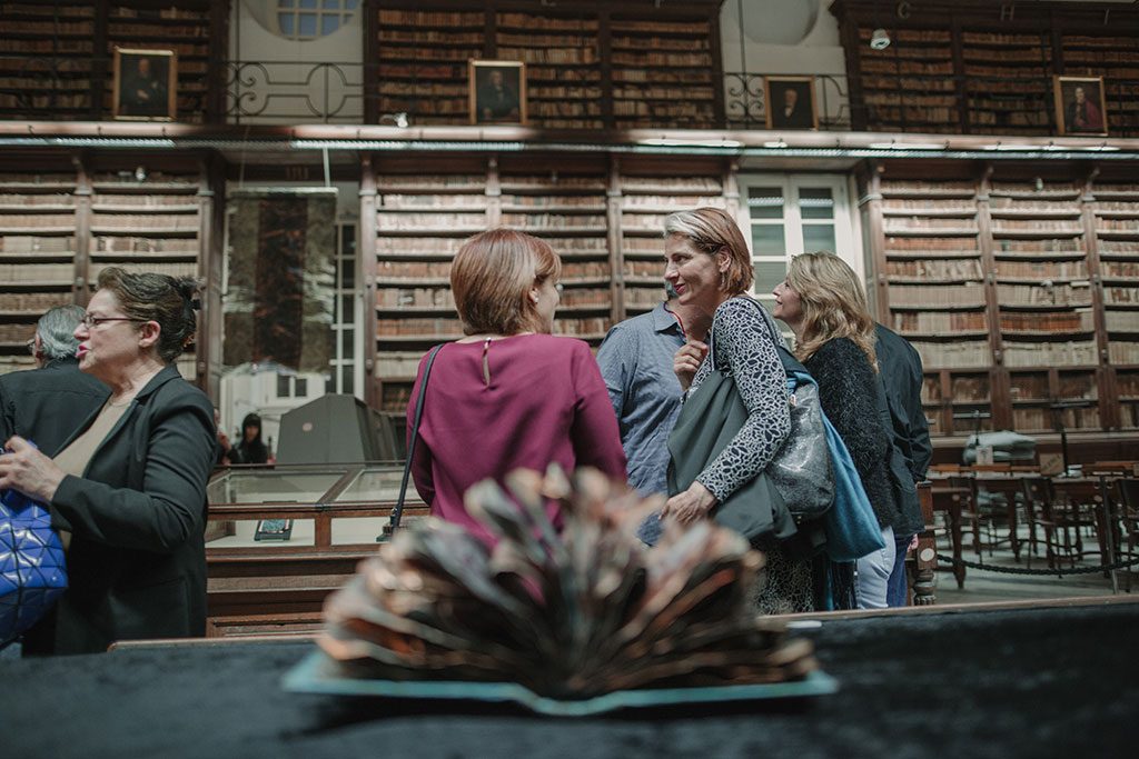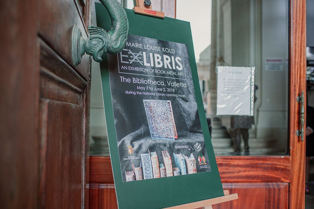 EX LIBRIS opened on May 5, 2018. Close to 200 art lovers attended the opening at the atmospheric Bibliotheca in Valletta, Malta. Metal books, scrolls and other text related works interacted with the beautiful old books of the library.The photo above was taken by the National Library of Malta, who also has this photo album from the event.All the photos below were taken by Therese Debono. The full set of her wonderful photos from that evening can be seen here.