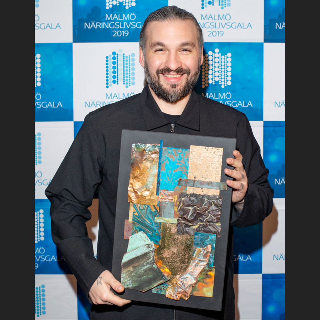 Passionate musician Steve Angello is a DJ, record producer, remixer and record label owner. He is also a member of Swedish House Mafia – and has just been awarded the Best Malmö Ambassador prize at the Malmö Näringslivsgala (Business Gala) on February 11, 2019. In addition to the prestigious title, he was awarded a prize that I was commissioned to create especially for him. I made sure the bespoke art prize was full of what inspires him and also what he has created. Not least his two daughters, Winter Rose and Monday Lily, in the form of carefully shaped copper blossoms and a lily etched into the reflecting brass.The artwork is made of etched and patinated copper, brass and bronze and measures 30×45 cm. The prize was presented by Malmö Mayor Katrin Stjernfeldt Jammeh and last year’s winner, award-winning chef Tareq Taylor. Below are a few details as well as the full work.