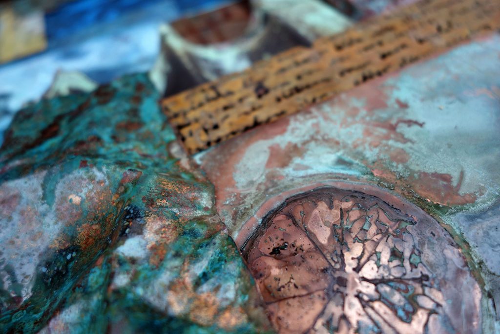 Internationally renowned Malmö chef Tareq Taylor was named “Best Malmö Ambassador” at Malmö Näringslivsgala (Business Gala) on February 12, 2018. In addition to the prestigious title, he was awarded a prize that I was commissioned to create especially for him.The artwork is made of etched and patinated copper, brass and bronze. For this work I also used salt, vinegar and lemons as part of the patination processes. The work measures 30×45 cm. Below are a few details as well as the full work.[Photos from the Business Gala by Pierre Ekman]